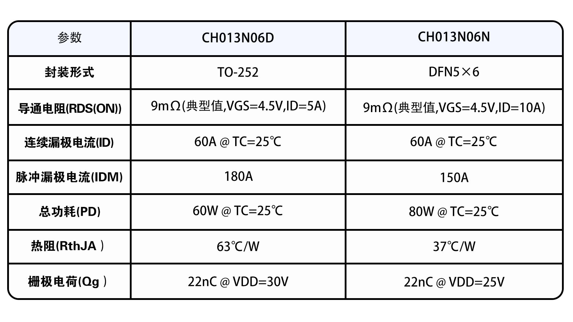 CH013N06D采用TO-252封装,适合用于各种标准应用,便于集成和替换。而CH013N06N则采用DFN5×6封装,体积更小,适合用于高密度电路设计。这两种封装能够满足不同的空间布局和设计需求。